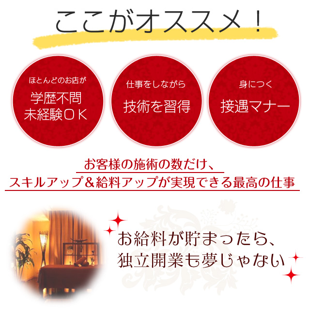 全て設備が完備した高級エステサロンから、マンションの一室で営業しているお店、または完全予約制の隠れ家的なお店まで、営業スタイルも様々。
